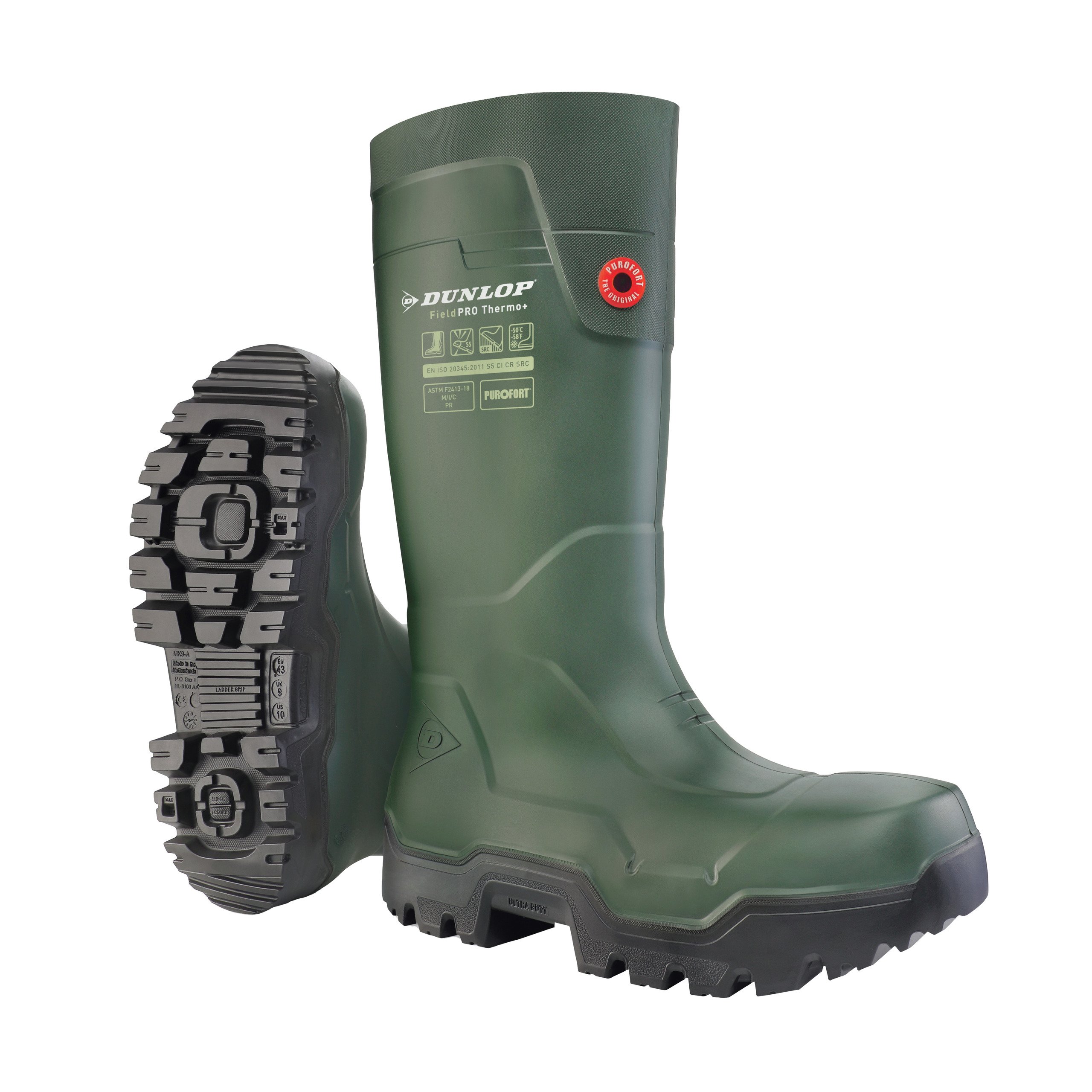 Purofort FieldPro Thermo+ je bezpečnostná gumená čižmy pre profesionálne práce v priemysle, hospodárstve a lesníctve. Vďaka inovatívnemu tvaru Dunlops Sneaker-fit sedí táto bezpečnostná čižma skoro ako bežecká obuv a udržuje pätu pevne v polohe. Táto gumená čižma ponúka najvyššiu úroveň izolácie pred chladom vďaka jedinečnému materiálu Purofort od spoločnosti Dunlop. Pretože tento špeciálny polyuretán obsahuje milióny vzduchových vreciek, je Purofort ľahký a pohodlný. V kombinácii s hrubou podrážkou s hlbokým profilom je Purofort FieldPro Thermo+ optimálnou voľbou do extrémne chladného počasia, ako aj na veľmi mokrý a blatistý povrch.