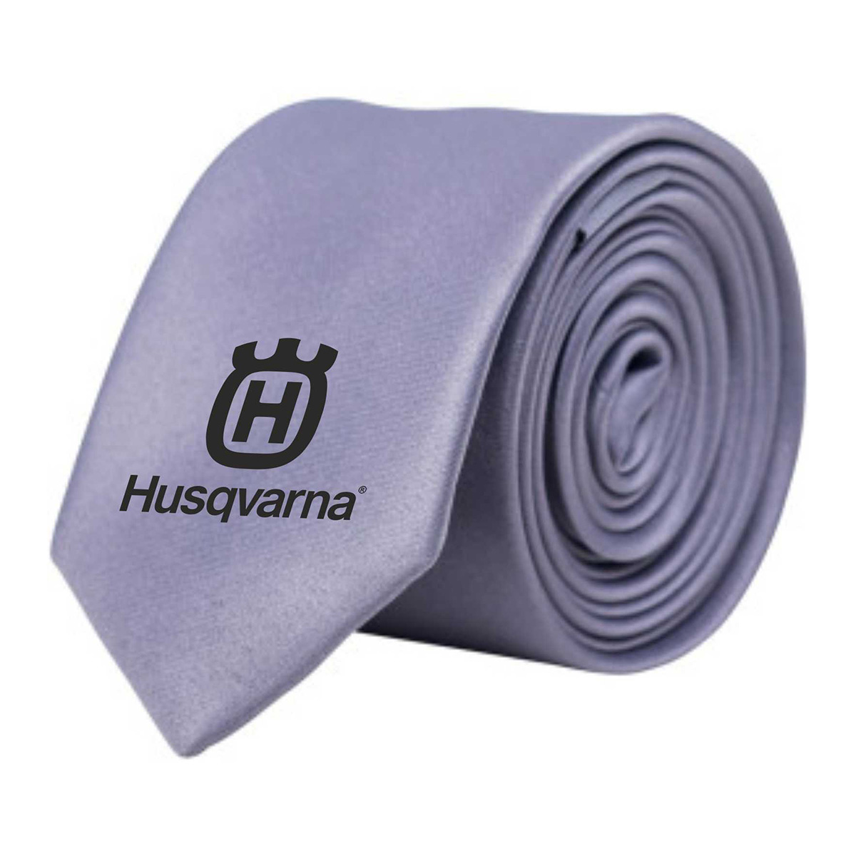Úzká kravata šedé barvy s černým logem Husqvarna.