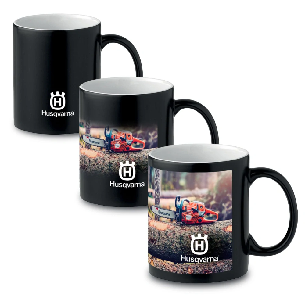 Černý hrnek o objemu 300 ml s bílým logem Husqvarna, se po nalití teplé tekutiny (o teplotě min. 50°C) změní na celobarevný obrázek s pilami Husqvarna.