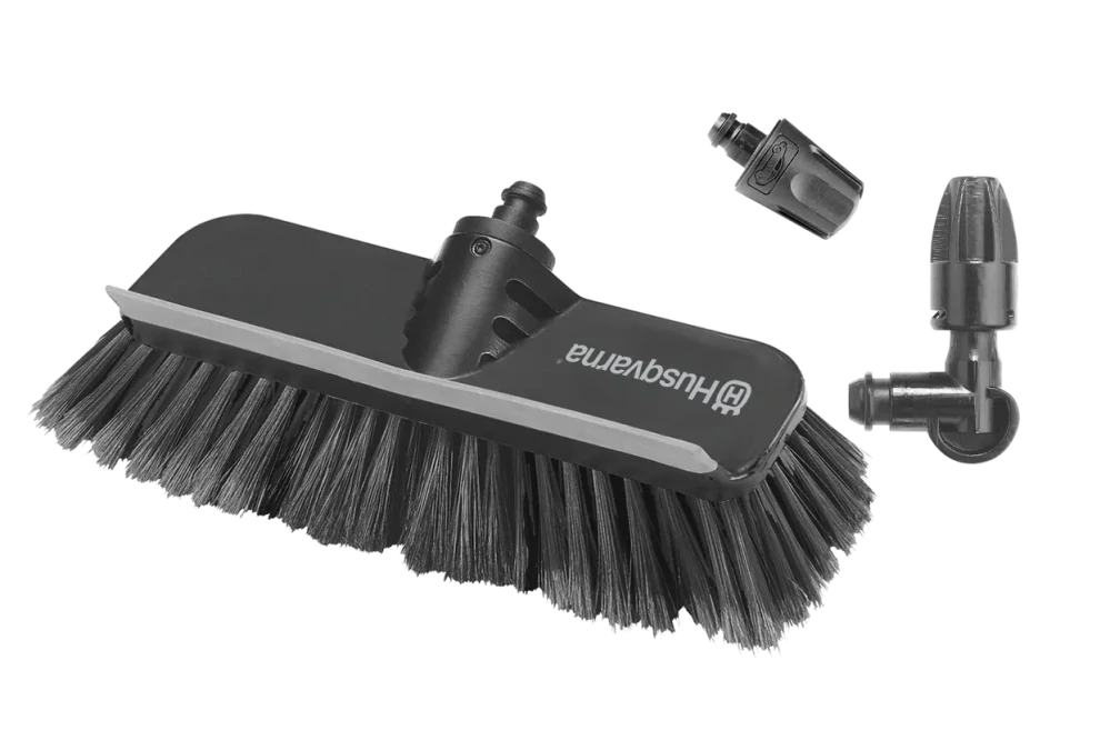 Súprava na umývanie vozidiel obsahuje širokú kruhovú dýzu na rýchle a jemné čistenie citlivých plôch, šikmú trysku pre ťažko dostupné miesta a umývaciu kefu so stierkou. Určené pre vysokotlakové čističe Husqvarna rady 100-300.